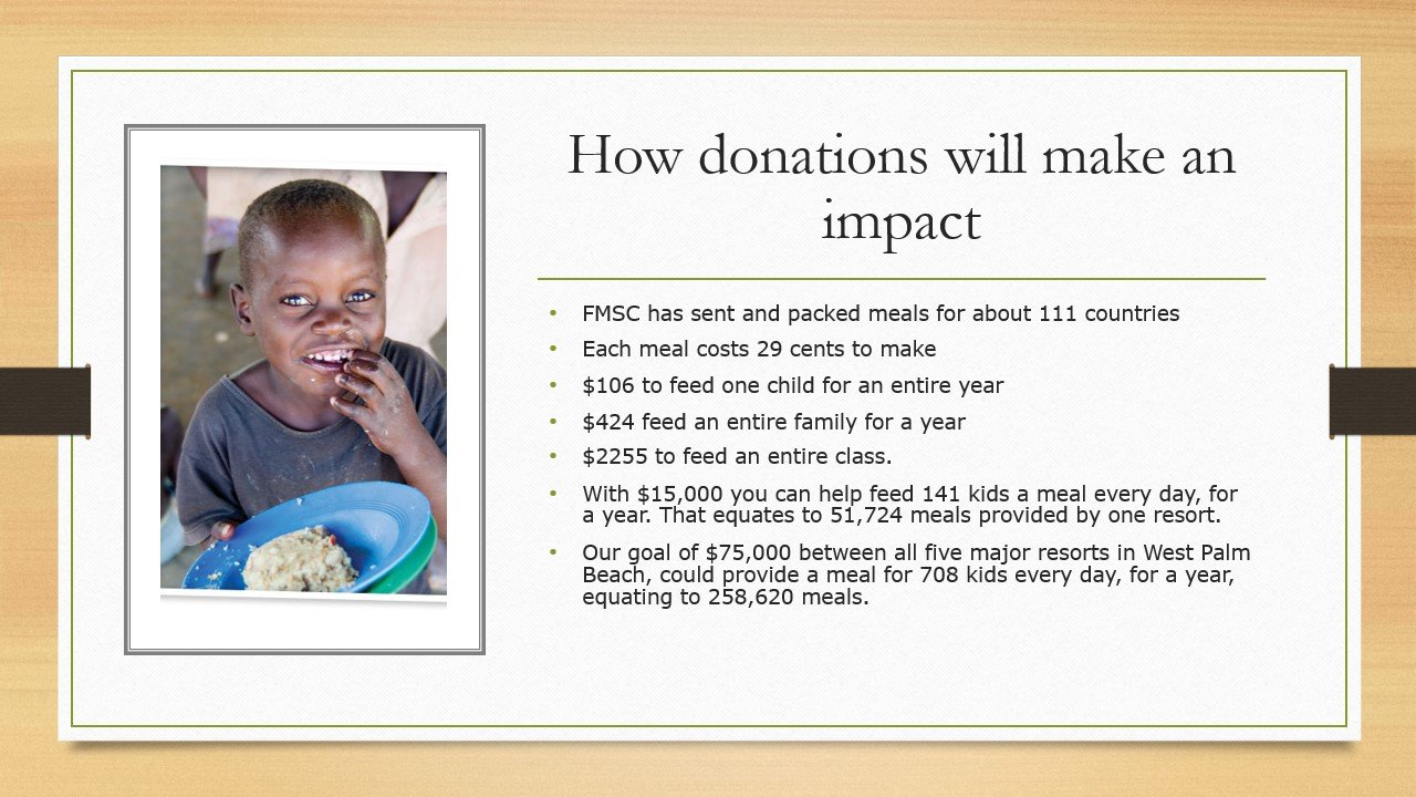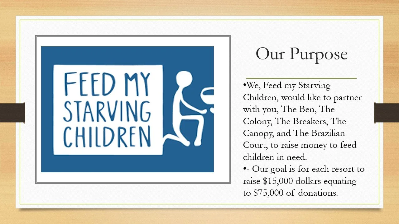 Objective: My team worked to persuade 5-star hoteliers in the Palm Beach market to include our non-profit “Feed My Starving Children” in their Corporate Social Responsibility initiatives to solve the real-world issue of world hunger.